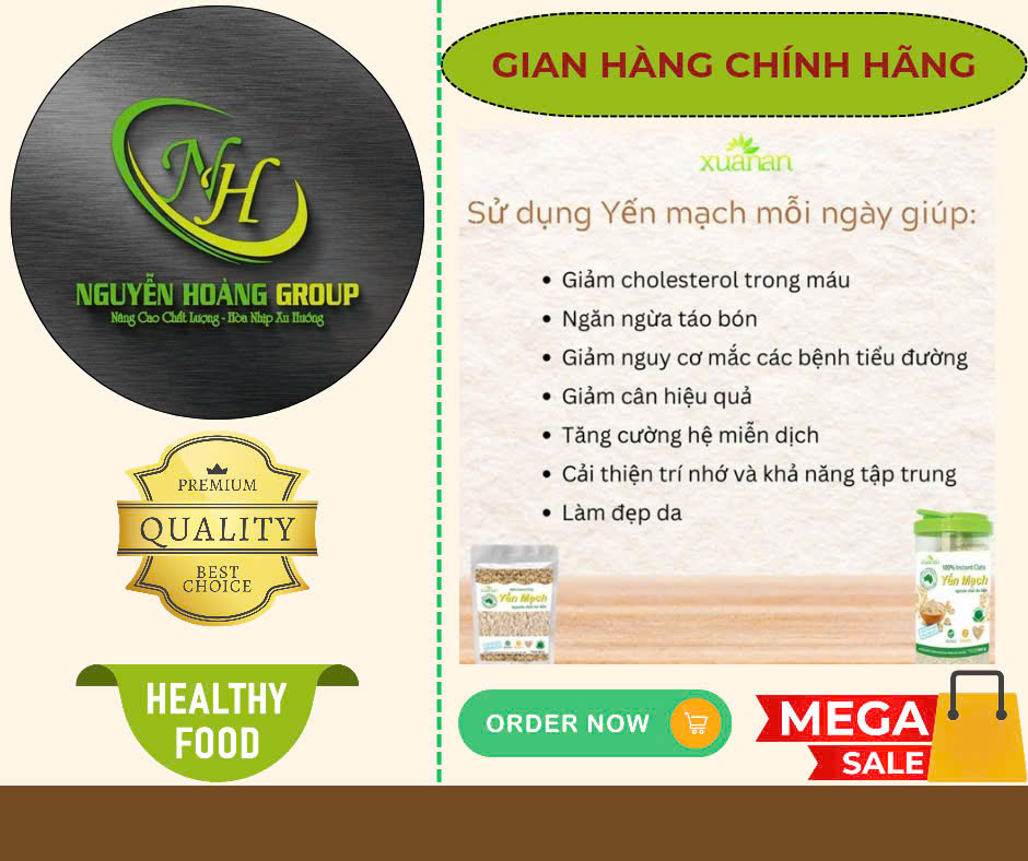 Yến Mạch Nguyên Chất Ăn Liền Xuân An Thành Phần : 100% Yến Mạch Nhập Khẩu Từ Úc Công Dụng: Là Loại ngũ cốc siêu tốt Thêm yến mạch vào khẩu phần ăn hàng ngày giúp giảm nguy cơ bệnh tim mạch, tiểu đường , cao huyết Áp, Giảm Lượng Colesterol trong máu , phòng chóng bệnh ung thư , loãng xương, béo Phì . Yến Mạch giúp tăng khả năng tập trung , tránh suy nhược thần kinh , tăng cường hệ miễn dịch cho cơ thể. Yến mạch cung cấp chất dinh dưỡng thiết yếu cho cơ thể , tăng khả năng chống viêm , làm lành vết thương. Yến mạch dùng để nấu cháo, rất giàu giá trị dinh dưỡng và chất xơ do đó rất tốt cho người bị táo bón Đối tượng sử dụng : Phù hợp tất cả mọi đối tượng : trẻ em , người lớn , người già Đặc biệt rất tốt cho người ăn kiêng , béo phì và người bị tiểu đường Quy cách đóng gói : 400g/ Túi Cách Dùng: Dùng để nấu cháo: Đun sôi 250ml nước cùng với ( Tôm , Cá , Lươn, Thịt Heo , Thịt gà, Thịt Bò, hoặc nấu chay thì thêm Nấm , Rau Củ) Sau đó nêm gia vị và 50g Yến Mạch Xuân An đun tiếp trong 3 phút rồi dùng. Sản Phẩm Yến Mạch Xuân An : Không hương Liệu , Không Chất Bảo Quản, Hoàn toàn từ tự nhiên. Hạn Sử Dụng: 12 tháng từ ngày sản xuất
