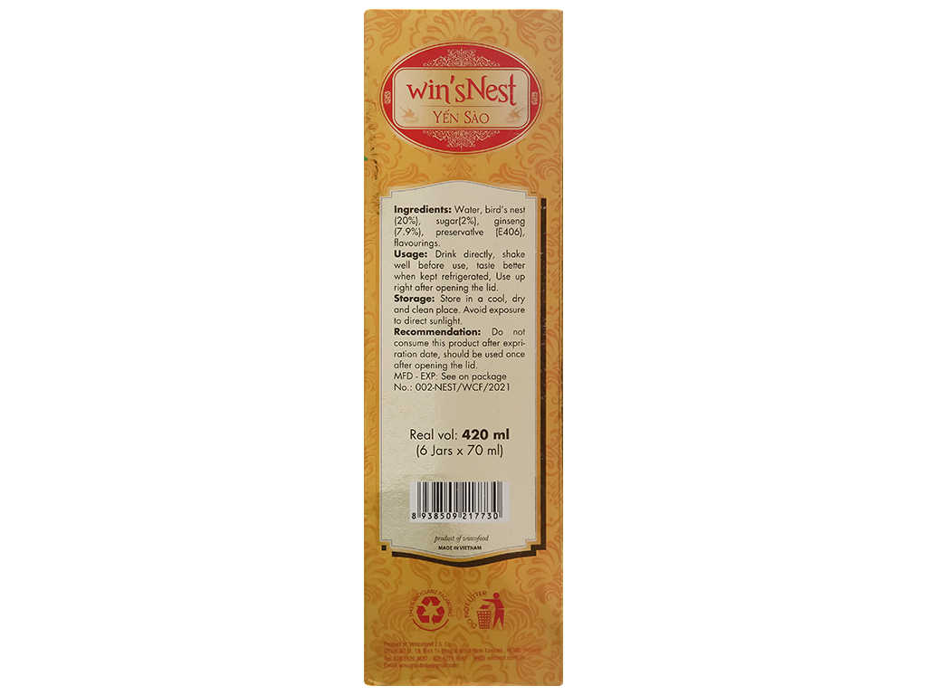Thành phần: Nước, yến sào (20%), đường (2%), nhân sâm (7.9%) chất ổn định (E406), hương liệu dùng cho thực phẩm.