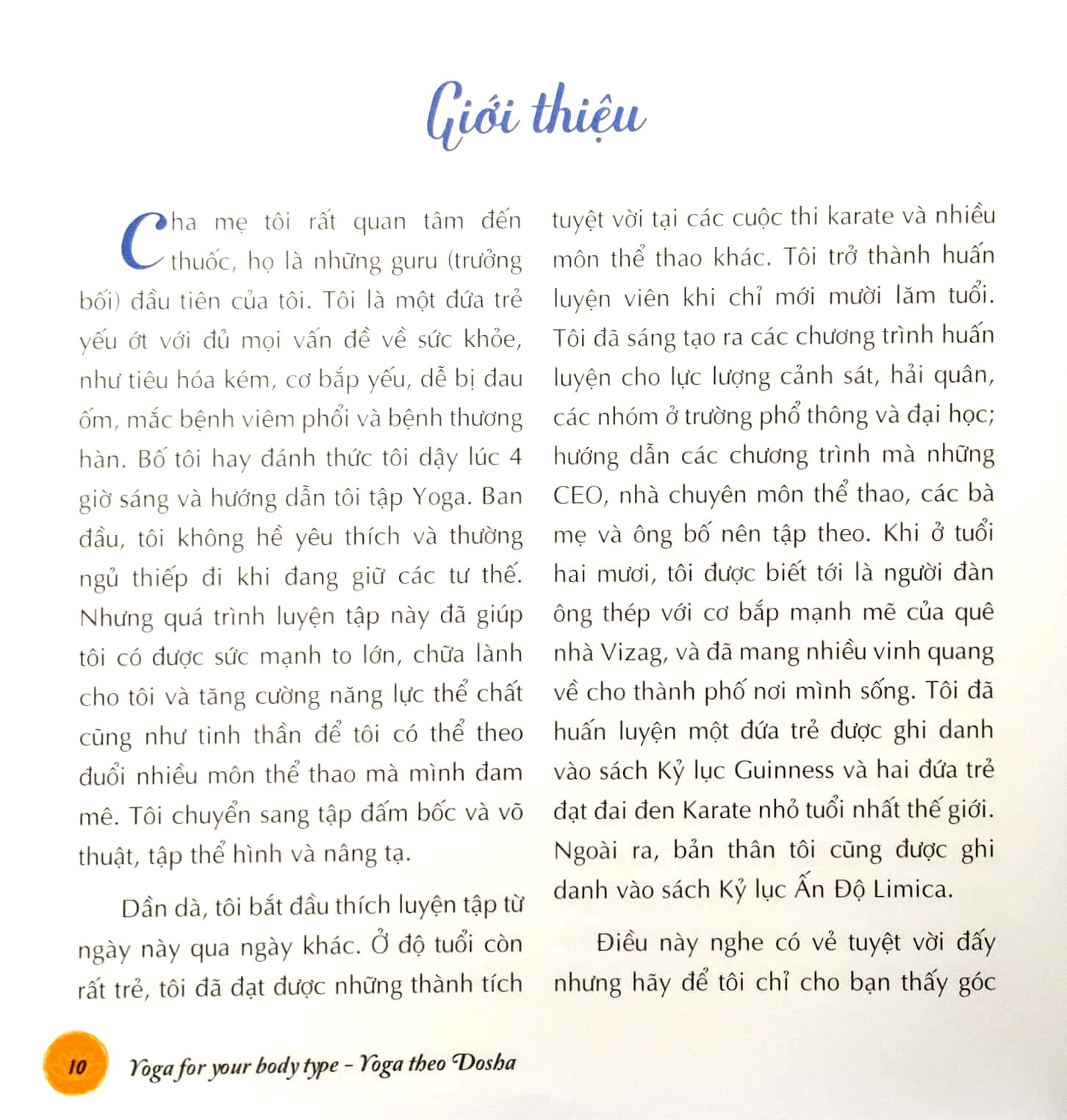 "Yoga theo Dosha" là một cuộc hôn phối hạnh phúc, đầy phước báu, an lành giữa Yoga theo Dosha (thể trạng cơ thể, tính cách và tâm thần) và Ayurveda (Phương pháp trị liệu thay thế bằng thảo dược, thực vật, lựa chọn thực phẩm và chế độ ăn uống, dành tặng cho những ai muốn tăng năng lượng, sống khỏe mạnh, bình an và hài hòa với thiên nhiên, môi trường.