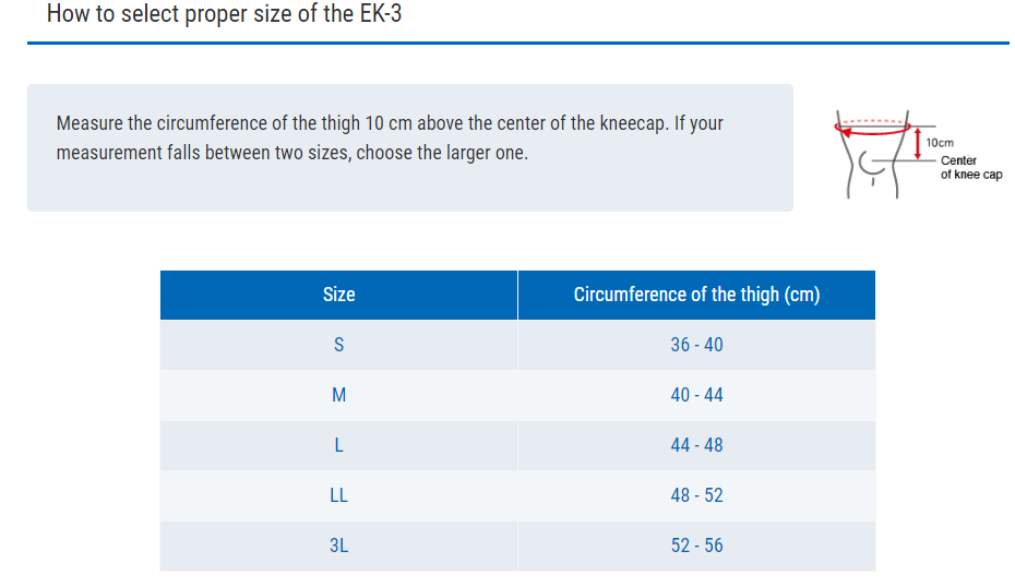 - Trên trung tâm của xương bánh chè 10 cm, đo chu vi của đùi . Nếu số đo của bạn rơi vào cả hai kích thước, hãy chọn kích thước lớn hơn.